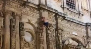 Nonostante gli sforzi per convincerlo a scendere, si è arrampicato ancora più in alto, sulla facciata della chiesa, apparentemente disturbato dalla folla di curiosi che si stavano radunando.