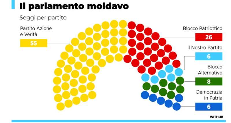 Il partito che esce nettamente rafforzato è il “Partito di Azione e Solidarietà”, che ha fatto il pieno con ben 55 seggi. Segue, a distanza, il blocco che riunisce le forze di sinistra, ovvero “Blocco Patriottico dei Socialisti, Comunisti, Cuore della Moldova” e “Futuro della Moldova”, che ottengono insieme 26 seggi.