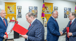 Il socialista appare con un mazzo di rose rosse tra le mani. L’ambasciatore russo ha una valigetta e pare che abbia letto a Dodon ciò che Putin gli ha scritto.